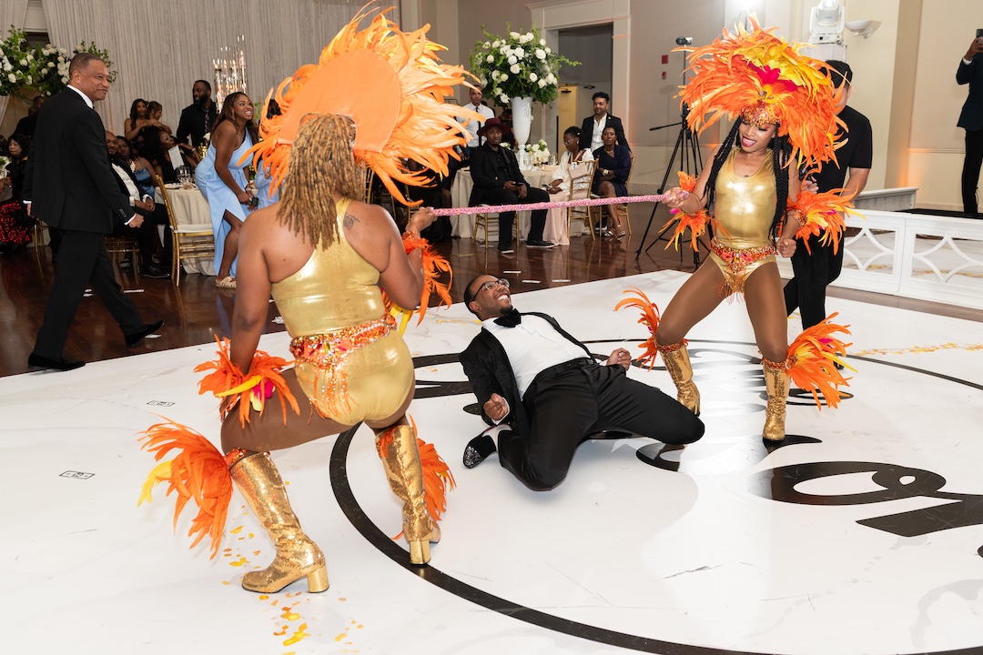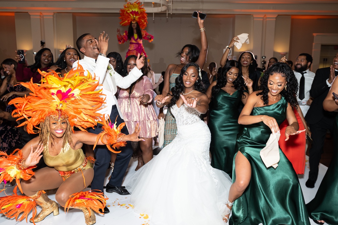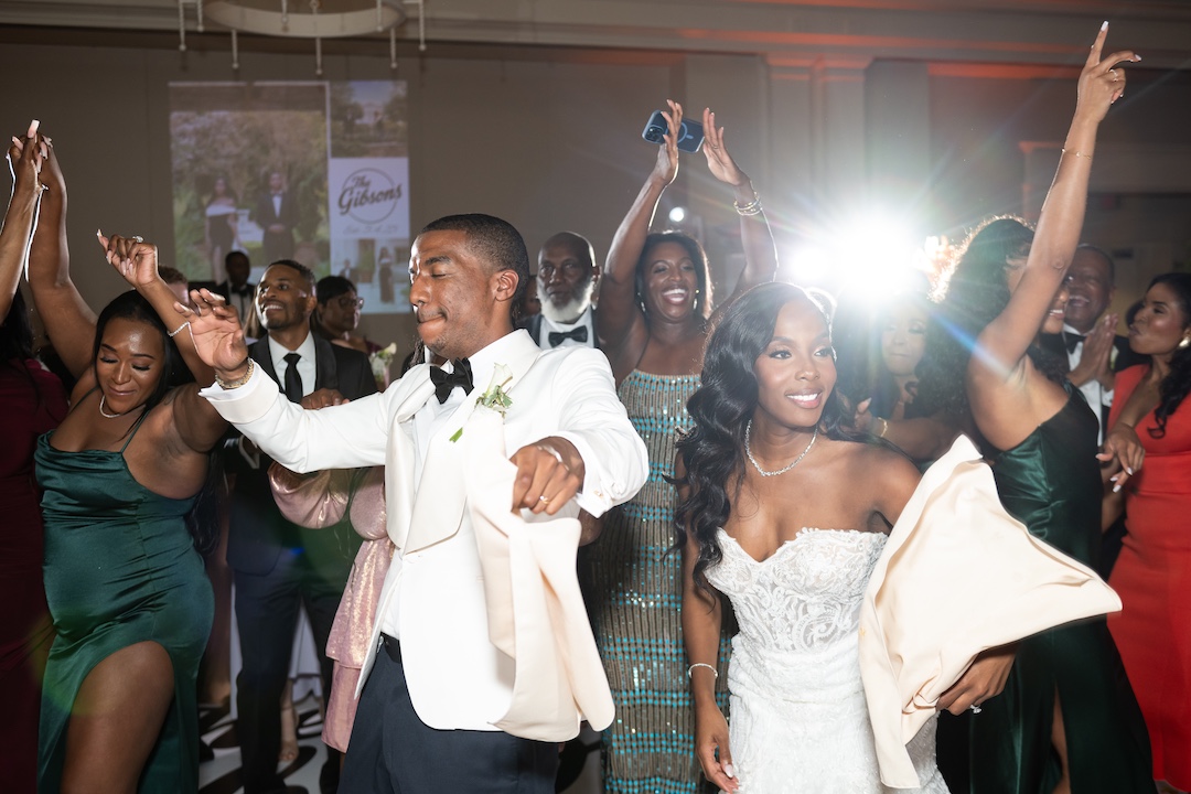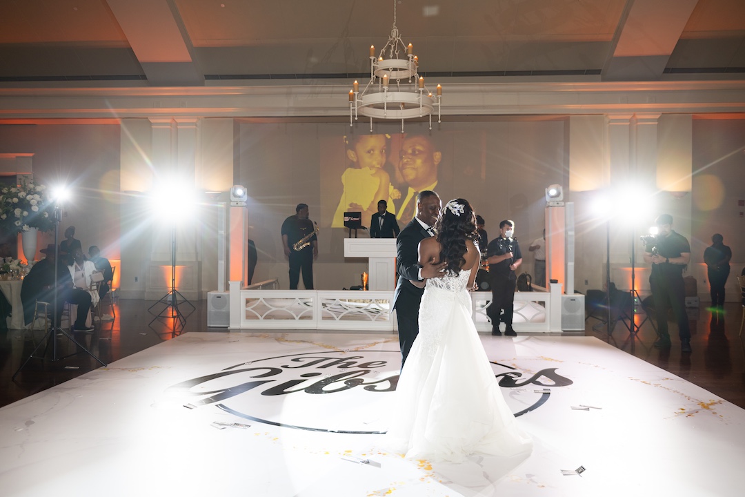 Thanks to the planning expertise of Platinum Eventions, one of Atlanta’s premier luxury wedding planners, every moment flowed seamlessly. The floral arrangements by The Perfect Creation added elegance throughout the space, while Confection Perfection Cakes wowed guests with a stunning wedding cake design. When it came to entertainment, J² Entertainment delivered a full luxury wedding band experience. Our team blended the best of live music and DJ entertainment with a DJ, emcee, live saxophonist, and drummer, creating the energy of a live Atlanta wedding band with the versatility of a DJ. Guests were on their feet all night, enjoying a performance that felt like a private concert. To transform the space, we added wireless uplighting, custom moving head party lights, and a 20-foot digital backdrop. The digital backdrop personalized the evening with custom slideshows and videos during the first dance, father-daughter dance, and mother-son dance, and shifted into vibrant visuals during the party. It created an immersive, one-of-a-kind atmosphere that made Ryan and Meagan’s reception unforgettable.